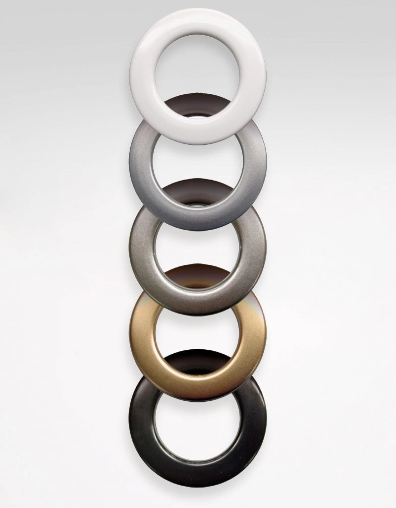 Plastic eyelets with an inner diameter of 36 mm, suitable for all our 26–28 mm curtain rods. The eyelets are pressed onto the curtain. white, silver, anthracite, steel (matches stainless steel and steel), antique brass, and black. 100 eyelets per pack.