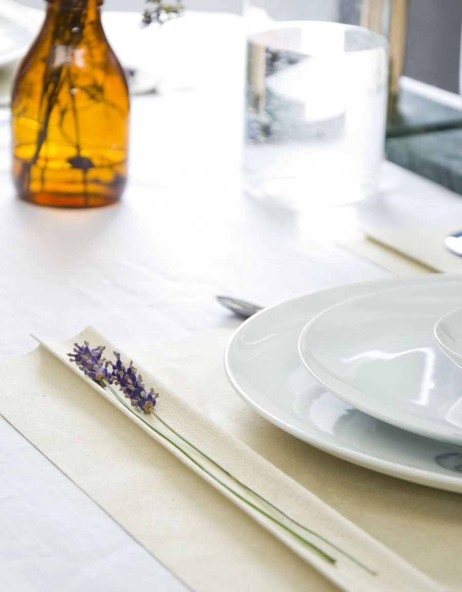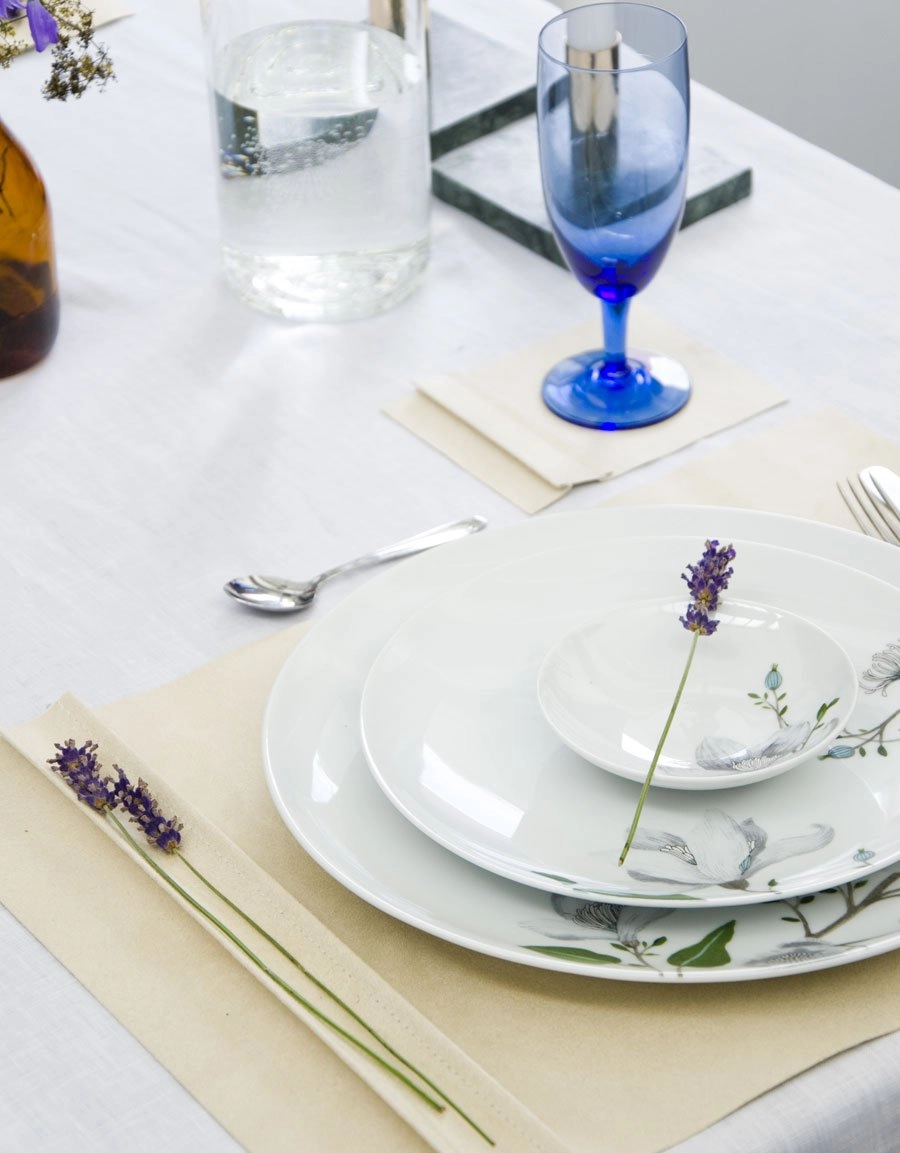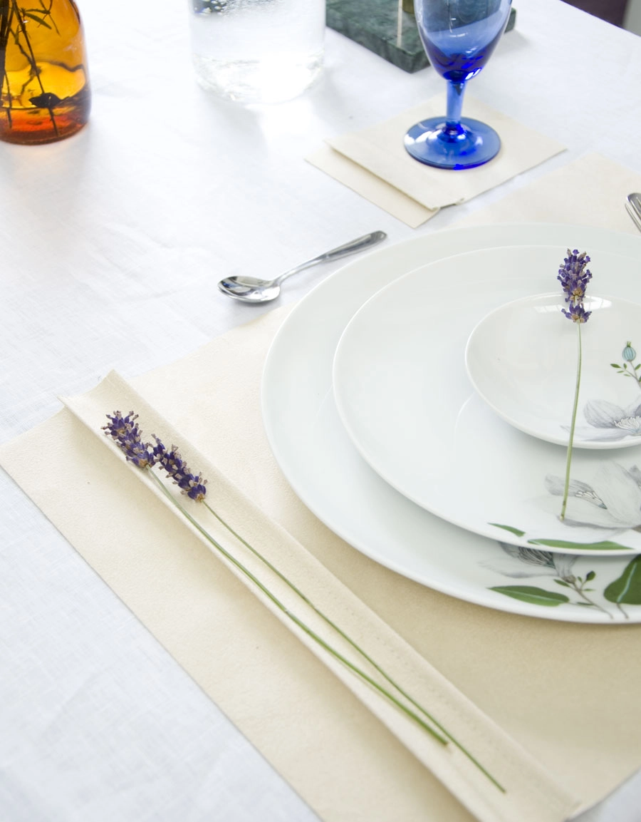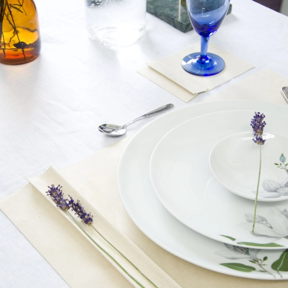 The placemat has a decorative side edge with space for decorations such as a flower or place card.
