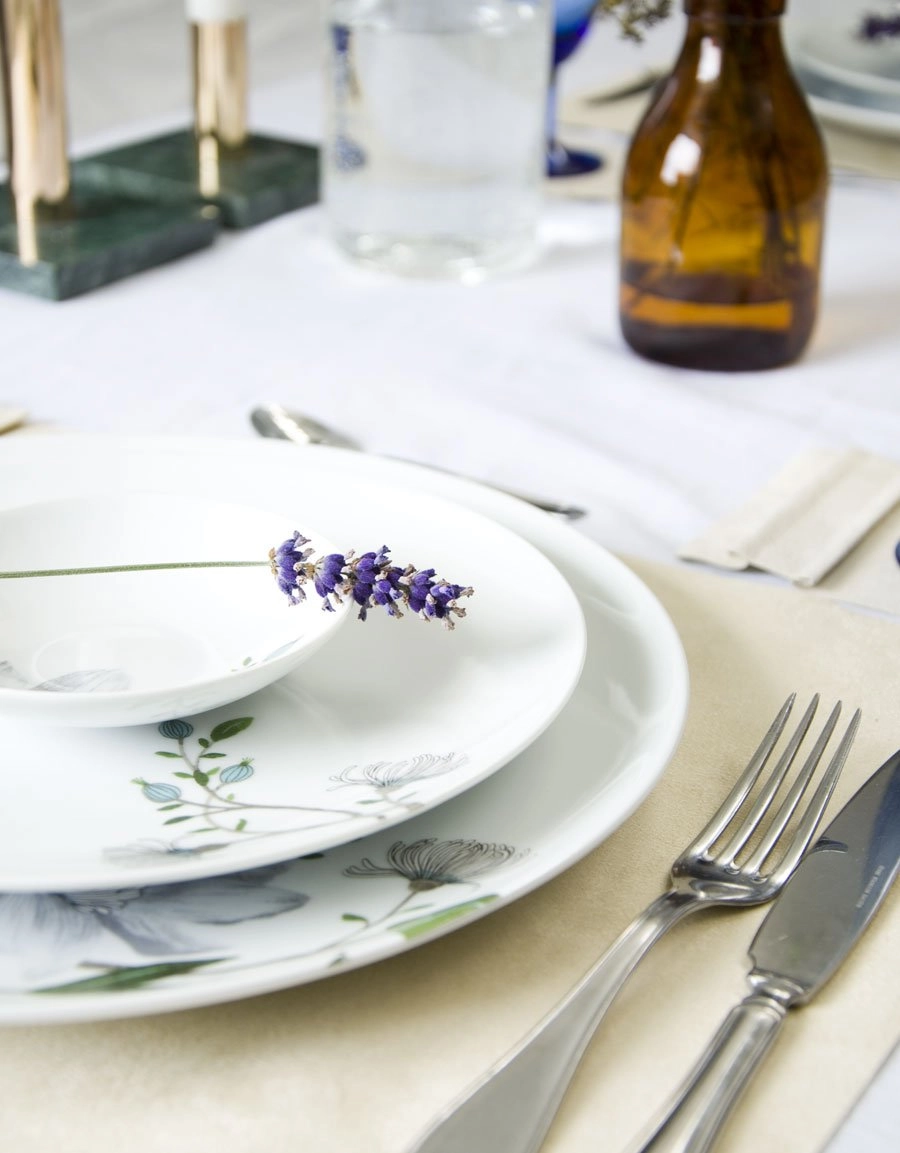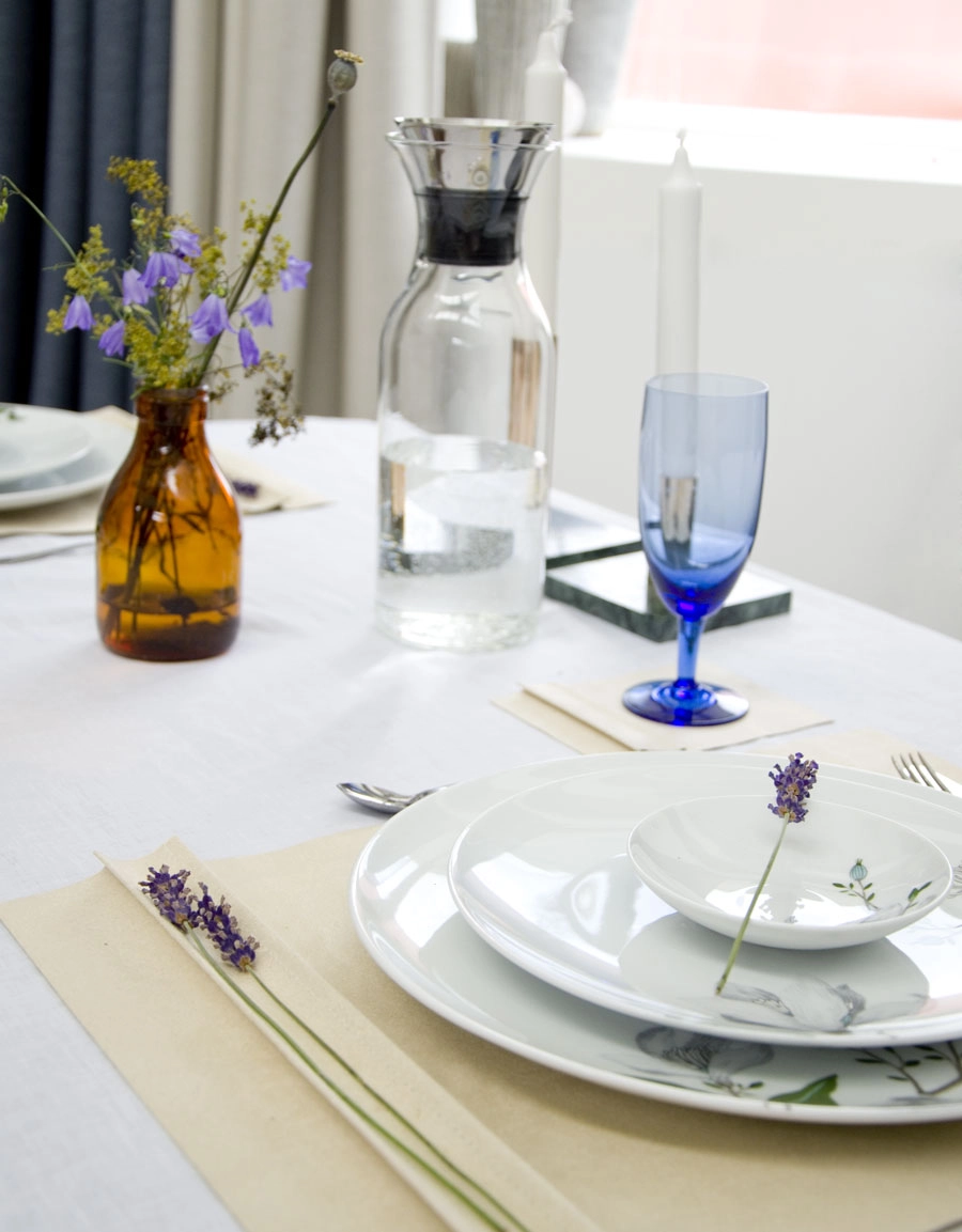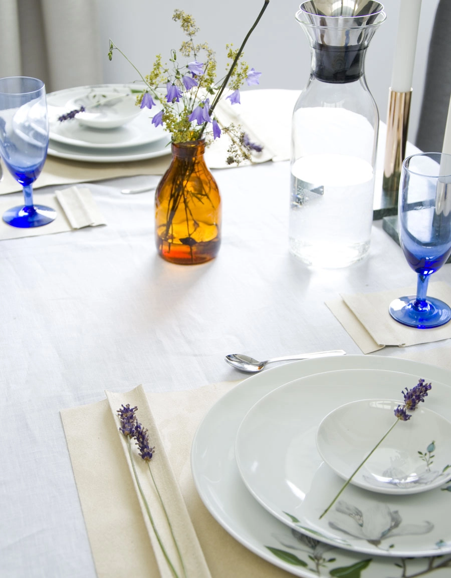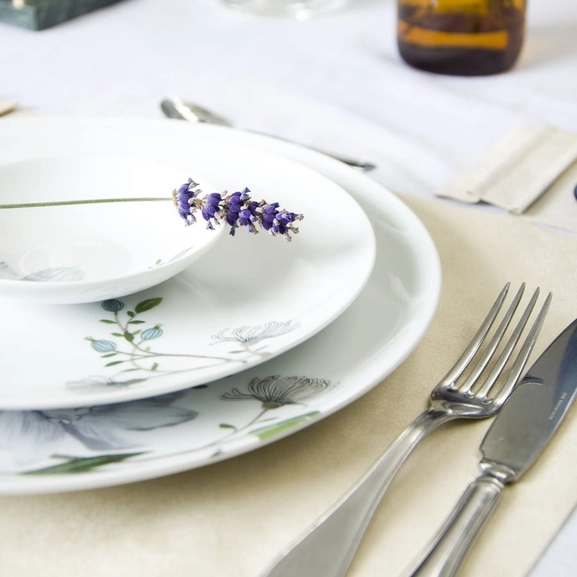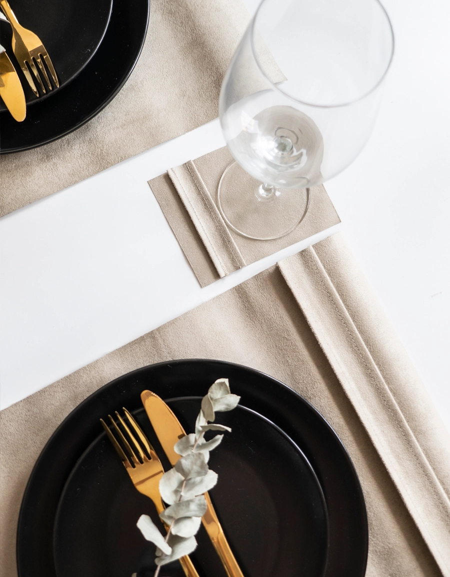 The placemat has a decorative side edge with space for decorations such as a flower or place card.
